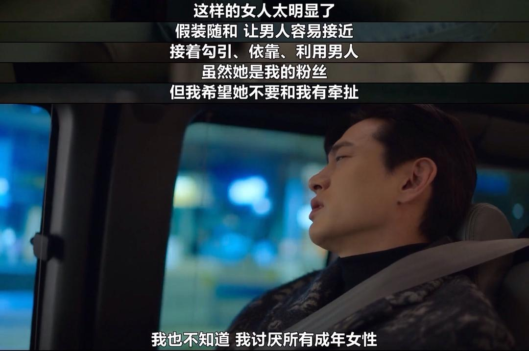 甚至编剧为了让两人的爱情顺利成章,更是牺牲了女主外几乎其他所有女性的形象,让她们沦为男主口中利用逆向歧视占尽优势的势利者????故意在女主面前提及过往的前女友,为了男偶像和一堆女性打成一团的追星女,看到帅哥脑子就停止运转的花痴,紧逼仅仅是肉体关系的异性结婚,有公主病耽误片场进程的女明星。看到这些配角,哪怕女主再强劲飒爽,结局再显露出社会的性别歧视,也感受不到任何对女性友好的态度。