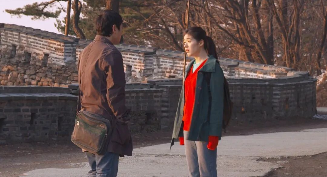 于是,在三天的日记里,我们跟随着翘了课的海媛,在首尔的名胜古迹间流连:从社稷坛和建国大学的两座雕像,到母亲故居附近的钟路图书馆,乃至南汉山城的城墙与旌旗。这些地方的历史性对洪常秀未必有什么意义,但它们的确作为不同寻常的景物,成为了海媛的情绪的一种略显感伤的外延。3月末,正是早春时节,冷气尚未完全散去,和时而飘下的小雨一同涂抹出苍白的天色。从这个角度看,《海媛》的方法并不是孤例,它开启了日后一整个作品系列,从《独自在夜晚的海边》(밤의 해변에서 혼자, 2017),到《在你面前》(당신얼굴 앞에서, 2021),再到《旅行者的需求》(여행자의 필요, 2024),它们都将一个女性形象叠印在一片风景之上,从中发现了一次孤独但充满感受力的旅程。如果说金敏喜、李慧英和伊莎贝尔·于佩尔(Isabelle Huppert)分享着一种因年龄的增长而愈发空灵沉静的气质,那么郑恩彩的年轻——以及模特一般出挑的外表——则赋予了她一种独特的活泼和笨拙,无论是对教授说她“疯”的记仇、在同学酒桌上的破罐破摔,还是与母亲相处时的暗自神伤、吵架撂狠话之后心软的眼泪,这些正在经历失去的人所特有的过分敏感与反复无常,都被以一种更为天真外露的方式演绎,仿佛一个未经世事的女大学生还没有学会隐藏自己的心事。