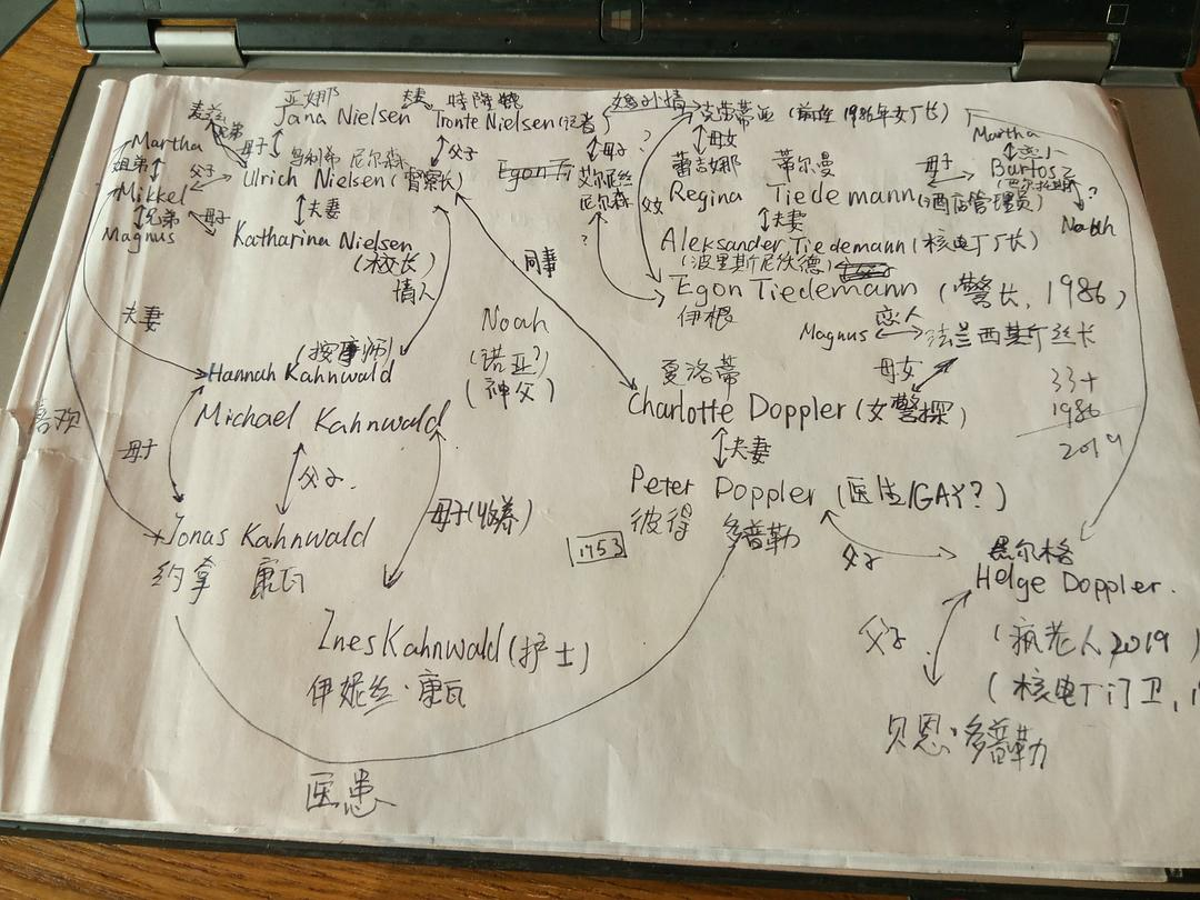这部剧前四集都在铺陈,从第五集《真相》开始脉络逐渐清晰起来,整部剧看完,我大概有了个框架——这部剧涉及2019/1986/1953三条时间线(实际上有四条)和四个家庭四代人的故事,人物众多,线索复杂。看的过程中记了超多笔记,对着笔记一个人物一个线索的认,我的脸盲症已经彻底被治好了。