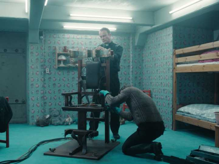 最后,画面再次来到怪异的房间,埃里克被绑在椅子上,圆形的金属块环绕在他脸的周围。他会遭遇与发现的男孩一样的命运吗?n