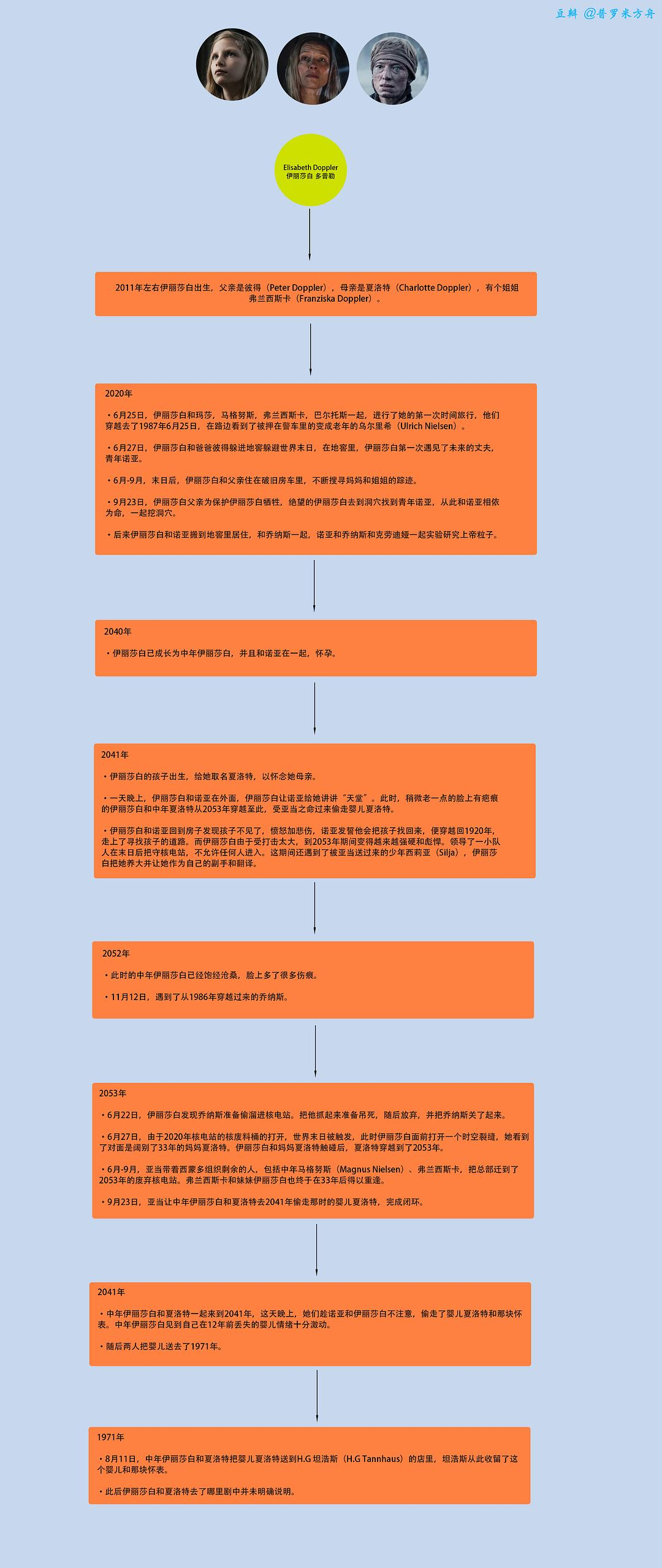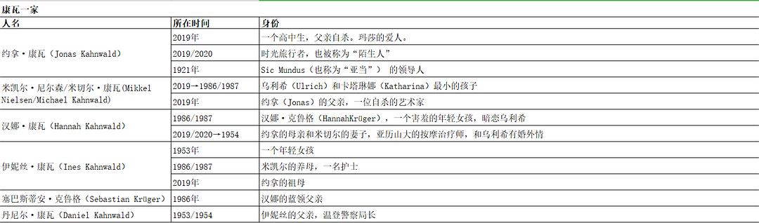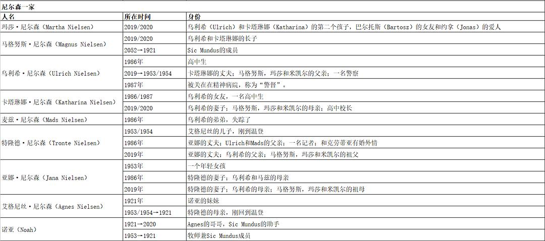 旧世界里,无名氏和艾格尼丝生下了特隆德,特隆德和亚娜生下了乌利希,乌利希和凯瑟琳娜生下了玛莎和米凯尔,米凯尔/米切尔和汉娜生下约拿