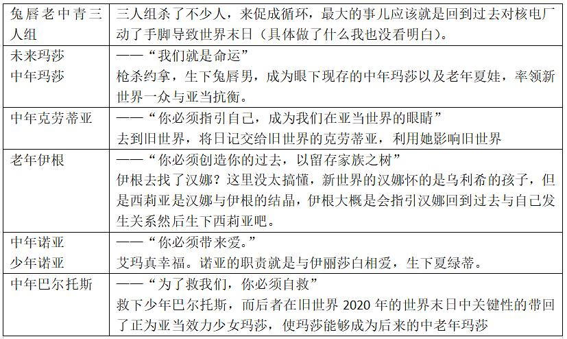 但是如果使用"决定论”来理解这个,那就简单了,克劳迪娅之所以参透一切并且找到解决办法,因为那是她的命运,是上帝(时间或者世界实体)给她的。玛莎和乔纳斯能够阻止一切,也是命运。