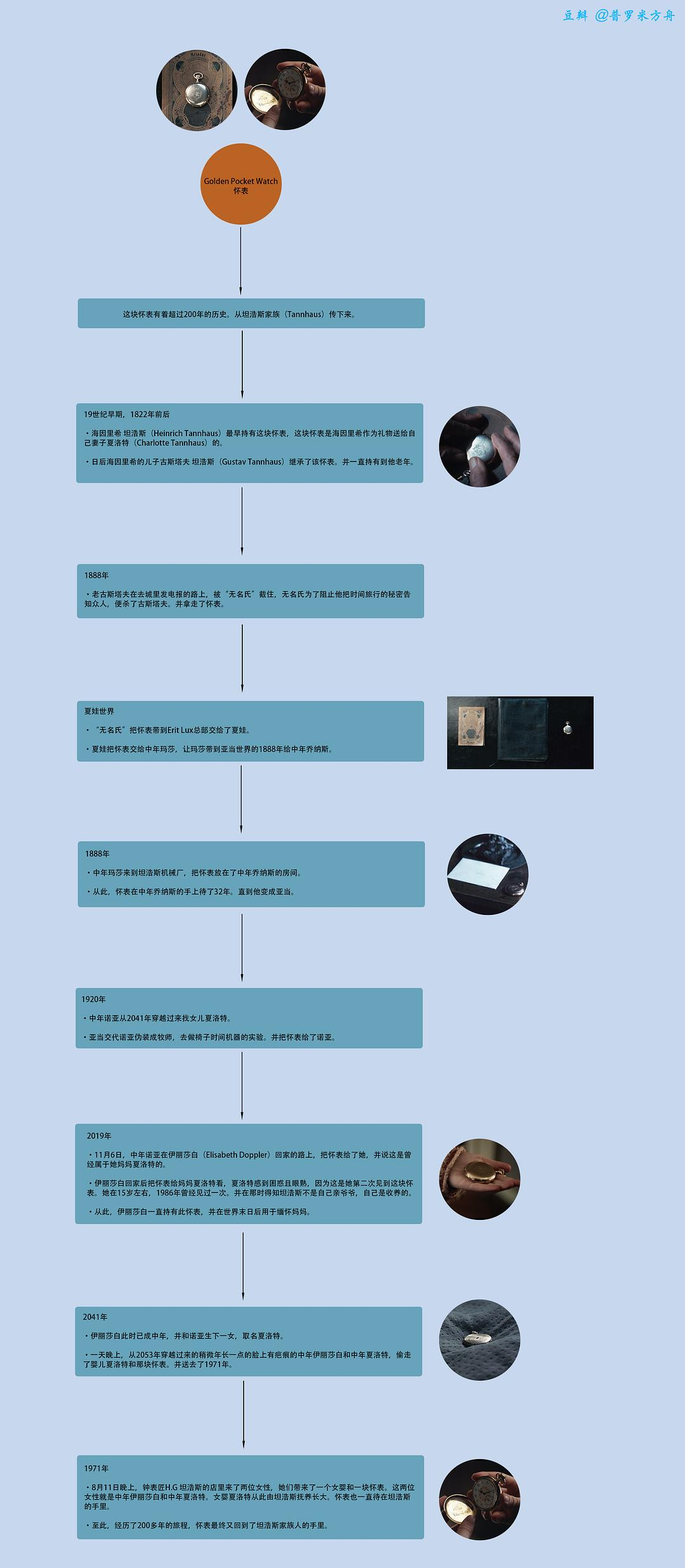 是两个连在一起的CTC,这两个CTC上的事件在因果循环(causal loop)的概念下无限循环,CTC不可能从其曲线里中任何一个点生成,也就是Dark里说的“开始就是结束”或者说没开始也没结束,所以这个时间机器剧情完美的交代了了两个世界从无到有的开始,也同时完全符合CTC只可以一次全部存在不可能从某点生成的概念,和现代科学挂上钩,保持严谨。这种一霎那形成也说明世界1世界2从有的时候就已经因果循环了,虽然说故事里人物与事物在无限循环的冥冥中增加了很多不同的小循环,包括人物(家族)间的循环和事物(比如小说,手镯,怀表,时间机器,项链,日记,手枪)间的循环,但是最终还是依据诺维科夫法则,不论是adam的组织施加的反作用力,还是martha2组织的引导都按部就班的推进循环。悲观一点的说, jonas-stranger-adam, martha-eva这两个家族随着CTC一起生成的产物,或者其他被卷进去的人,在这个封闭循环里是没自由意志可谈的,所有行为按照因果而循环。