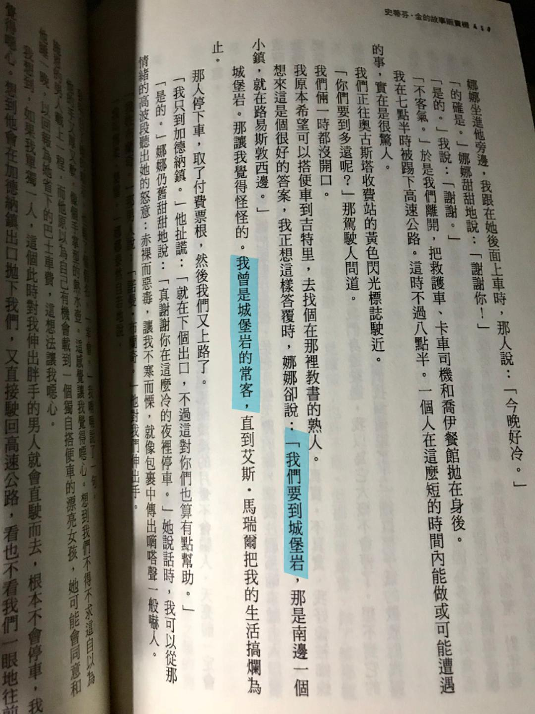 抛开这些不说,作为半个书迷,看城堡岩时最激动的瞬间是看到片头的破碎书页,忍不住疯狂按暂停找对应篇目。不过手边的原版书里只有 IT 和 Under The Dome 是跟片头有关系的,其他都买的台版……只好找电子版随意确定一下位置了