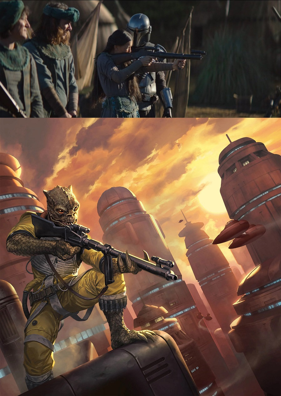 以一部烂俗的科幻片为起点,乔治·卢卡斯用数十部电影、小说、动画、游戏、冷笑话……“平地抠饼,对面拿贼”的给我们搭建出了一个事无巨细的“星战”世界。在这个世界里总有原力和黑暗面、绝地武士和西斯尊主的对立,总有火花碰撞的光剑和暴风兵手里永远打不到人的激光枪,总有诸如“飞12秒差距就可以走完科舍尔航线”千年隼,也会有争论不休的《星球大战》《星际迷航》哪家强的争论……当然,曼达洛人也是其中之一。
