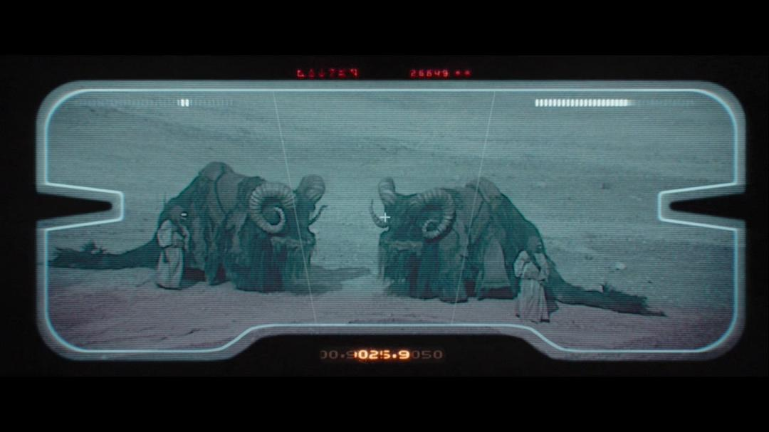 在这个场景里,屏幕左下角有一个R5系列宇航技工机器人(R5 series astromech droid),该型号最早出自《新的希望》。在屏幕中间有一个A-LT多功能机器人(A-LT Utility Droid),这是为2016年的《侠盗一号》创作的机器人型号。