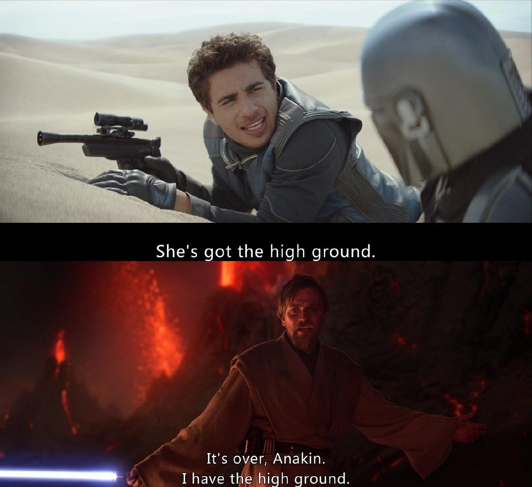 主角的台词“她占据了高地”(She's got the high ground)显然致敬了欧比-旺·克诺比在《西斯复仇》里的经典台词“我占据了高地”(I have the high ground)。这句台词之后,欧比-旺切掉了阿纳金·天行者的四肢,把断手断脚的阿纳金留在熔岩里灼烧,导致他以后不得不依靠厚重的盔甲维生。银幕经典的达斯·维德就此诞生。