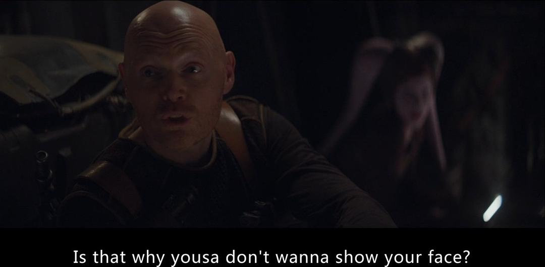 梅费尔德(比尔·伯尔饰)在这里模仿冈根人说话,把“you”说成“yousa”——这是冈根基本语(Gungan Basic)的口音特征之一,我们可以在《幽灵的威胁》中听到冈根人全都这么说话。