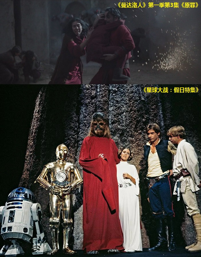 主角一家人在逃难时穿的红色长袍显然是向《星球大战:假日特集》致敬。在《假日特集》里,伍基人过生命节时,就穿红色长袍。