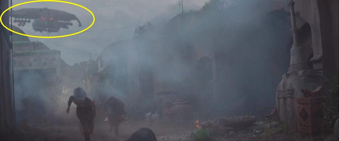这个镜头和《新的希望》的第一个镜头一模一样。镜头里出现的两颗卫星分别是戈姆拉森(Ghomrassen)和盖尔梅萨(Guermessa)。塔图因其实有三颗卫星,第三颗卫星舍尼尼(Chenini)因为距离较远,没有在镜头里出现。