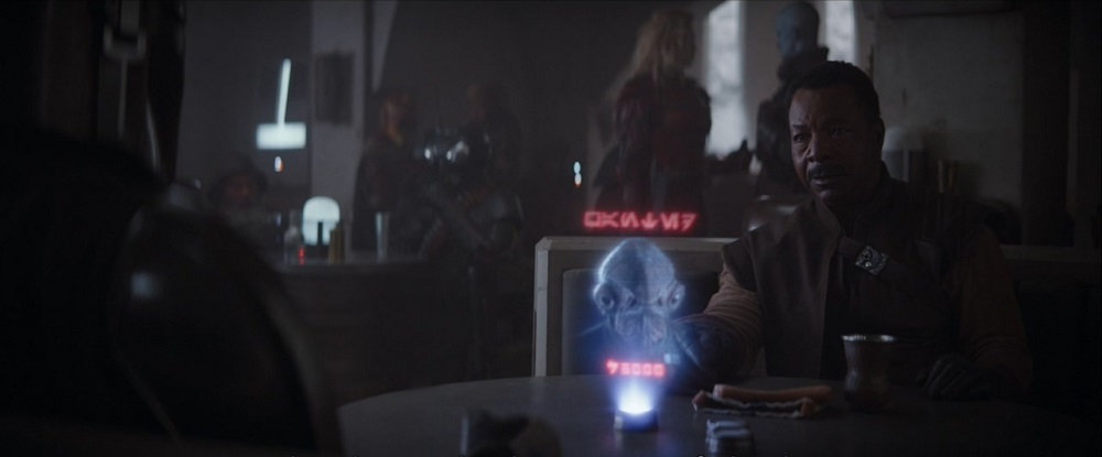 在这个场景里,屏幕右边有两个对话的特兰多沙人(Trandoshan)。特兰多沙人是《星球大战》作品里的常见种族之一,最早出自《帝国反击战》。罗迪亚人在这个场景里又出现了。n