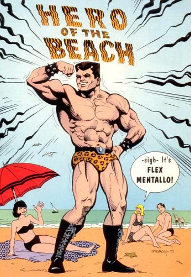 弗莱克斯·门塔罗(Flex Mentallo),在漫画中初次登场于末日巡逻队第35期。这个角色的人物形象和能力灵感来源于意大利裔美国健身运动员Charles Atlas和他的健身广告“海滩英雄”。这个广告的大意就是,有个强健肌肉之后才会成为“真男人”,成为“英雄”。Flex Mentallo的能力是“肌肉奥义”(Muscle Mystery),即通过收缩自身肌肉,在一定程度上修改现实;还有超级力量,超级耐力和超级毅力;他还可以召唤“海滩英雄”光环——就像那个健身广告所展示的。他的能力在剧集《末日巡逻队》S01E13中展现出来了。