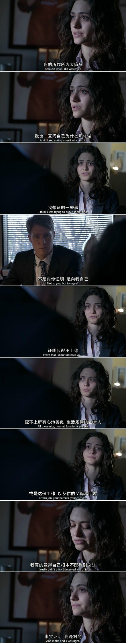 在感情上更是如此。父爱母爱的长期缺失,导致他往往有一种不安全感——连父母都不爱自己,谁还会无条件无限制的爱你?这样的自轻自贱自我降格,会让自己面对一切热烈的感情时,觉得惶恐而力不从心。“我怎么配?”就像《无耻家庭》里的大姐Fiona,总是忍不住搞砸自己的几段完美恋情。出生于那样一条烂街区,有那样一对烂父母,就像lip所说,她总觉得自己配不上更好的生活,一辈子只能住在那样的shit hole里。
