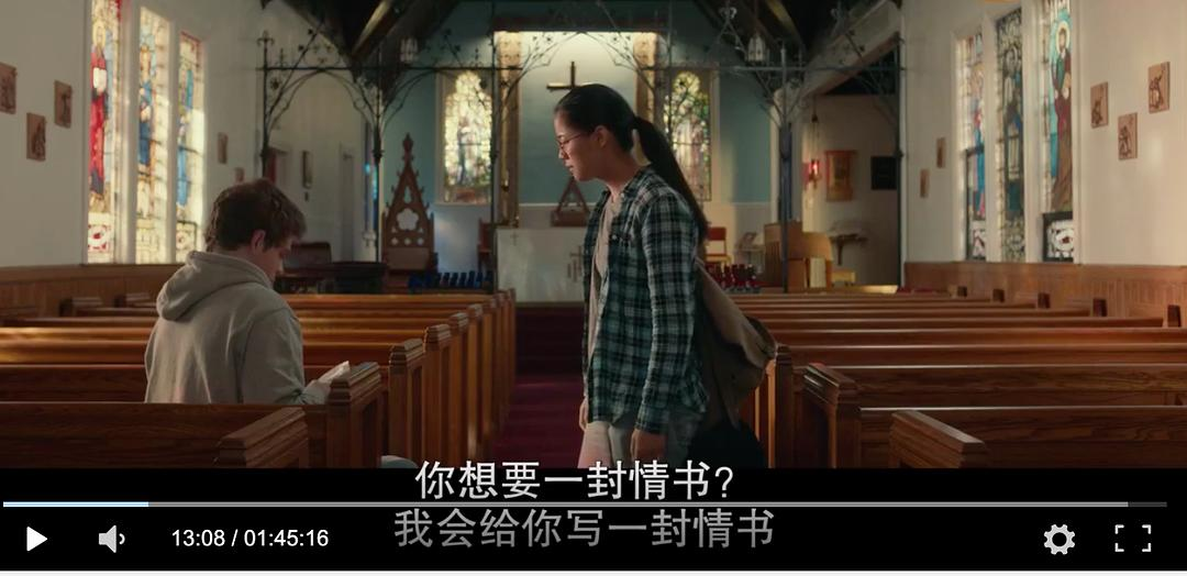 但是一封无意的「代写情书」,阴差阳错地把小镇上这两个孤独的人拉到了一起。Ellie对她的文学课老师说,「你知道终于遇到和你同龄又懂你的人是什么感觉吗?」——我猜就是找到了「the other half」的感觉吧。文字让这两个孤独的灵魂找到了慰藉,进而慢慢相互吸引、靠近(不得不说这真的很柏拉图,但是毕竟是电影,总要有一点浪漫想象的不是吗)。