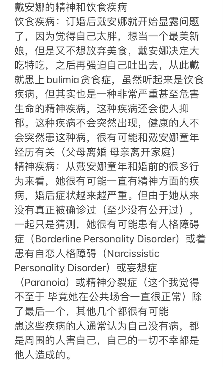 事实是戴安娜精神的确不太正常,在蜜月期就有症状了,查尔斯和王室找了好多医生给她检测治疗,但她不配合,最后只能不了了之。她不相信科学治疗,不看专业医生,从没有吃药治疗过,相反戴很相信占星术通灵师算命师及一些另类的心理治疗方式,她的一个占星师还写了一本书爆她的隐私。有趣的事,婚姻初期查尔斯给戴介绍了一个心理治疗师,戴去看了几次就不去了,结果查尔斯因为受不了婚姻及和戴一起生活的巨大压力开始看同一个医生,一直去了十几年,直到二人离婚查才停止去看这个医生。