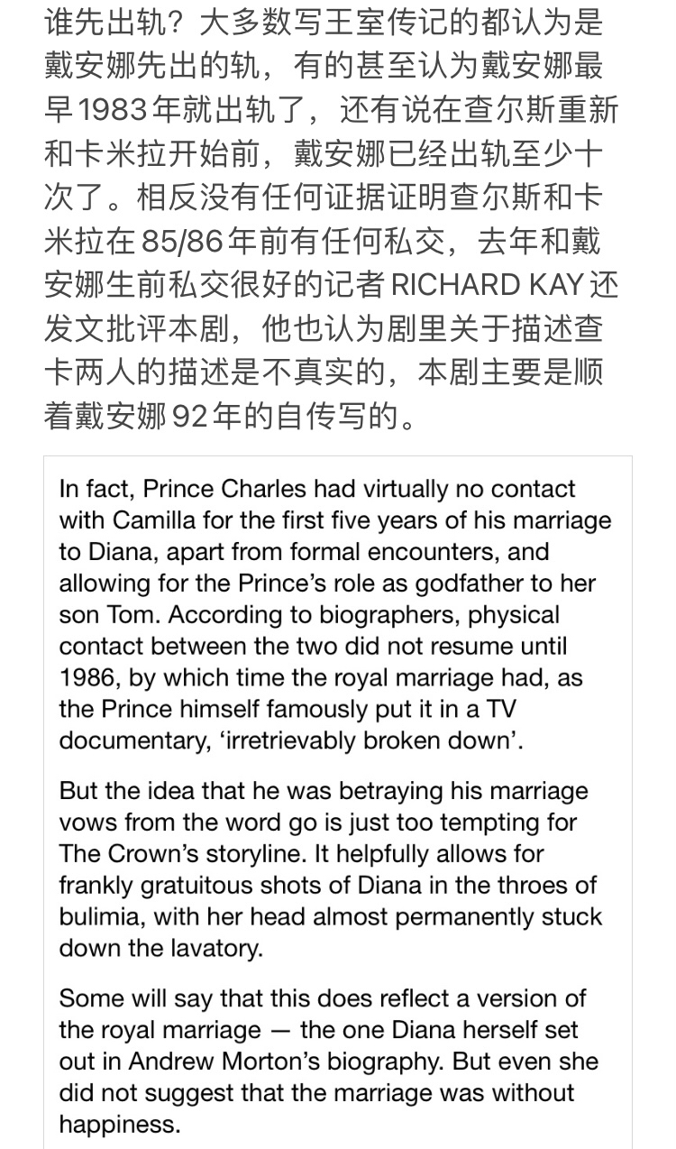 关于谁先出轨,大众的认知一直是查尔斯在婚前婚后持续不忠,剧里也是这么暗示的,其实并不是这样,就连戴安娜在1991年的录的私下采访中也说过查尔斯和卡米拉是在他们结婚五年以后才旧情复燃的,也就是1986年。(当然查尔斯持续的精神出轨还是很可能的)而戴安娜最早的出轨对象是1985年和她的贴身保镖Barry(在同一个采访里她自己承认的).这一段情在剧中只由Anne一句话带过,而这段情早于查卡。