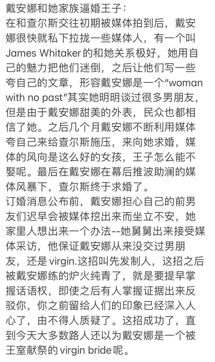看到有评论质疑我引用各种八卦小报的,说这些媒体不可信的,你怕是不知道90年代很多王室八卦头条的来源都是戴安娜本人吧,她和很多八卦记者私交甚好,经常和他们私下密会,商量着怎么赢得和查及王室的舆论战。