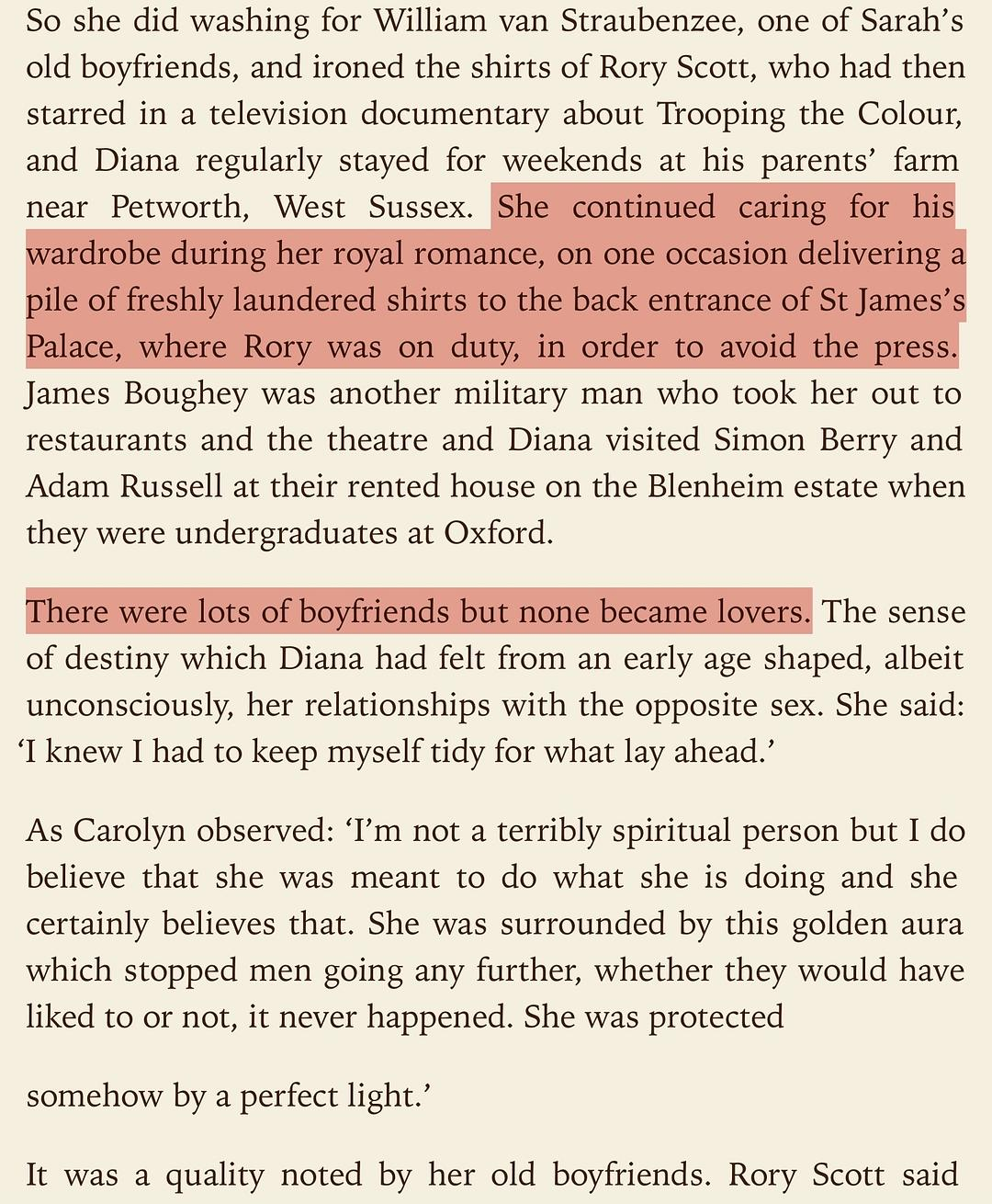 并不是,根据the real Diana一书(一个英国贵族圈人士Lady Colin Campbell写的 是关于戴安娜评分最高的传记 作者认识戴本人 戴本来想让这个作者写她92年发行的自传,但Campbell觉得戴的自传内容太不客观太多不实,不想帮她中伤她老公,拒绝了戴,戴就找了别人)和查尔斯之前,她交往了上十个男朋友了(很多是发生过关系那种 这一段把我看得目瞪口呆 不保真)虽然戴安娜当时才十七八岁,但当时的社会风气很开放,戴安娜觉得同时交往两三个男朋友很正常,网上可以搜到很多戴婚前和不同男性的亲密合照。戴和查交往初期,同时还有一个男友George,戴订婚后才和他分手(戴很聪明,交往的都是贵族圈里的,因为圈里人都很默契,知道规矩,怕得罪王室,不会自爆,所以在戴和查交往时,没有人出来公开承认和她有过关系)