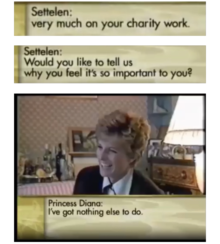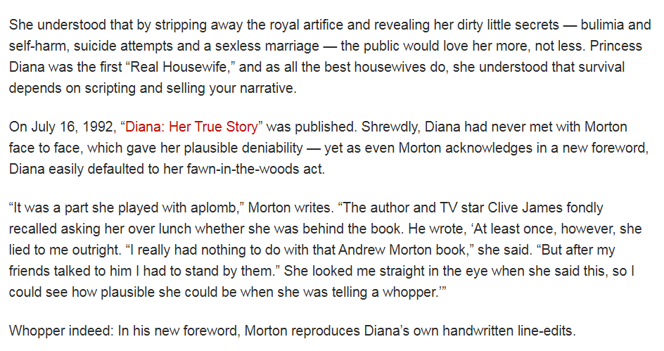 92年传记出版时 戴跟身边所有人否认自己参与了传记出版 说是关心她的朋友瞒着她爆料的 因为王室成员主动爆隐私是很Low的一种行为 但同时她又担心人民群众也相信了她和书出版无关就会怀疑传记的真实性 于是在传记出版时 她去见一个在传记里接受了采访的朋友 还通知媒体到朋友家门口来拍 就是为了给公众传达一个信息:迫于王室压力 我不能公开承认和传记有关 但你看我和在传记里为我发声的朋友关系还是很好 是我默许她们为我发声的 所以你们不需要质疑传记的真实性