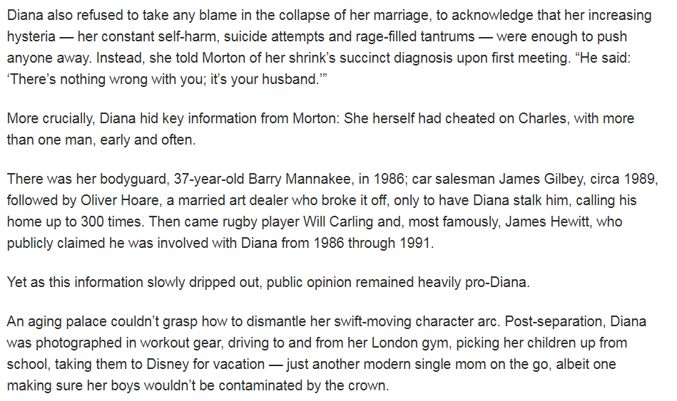 最近看了几本戴安娜传记有感,真的是大开眼界,只看了一部分,信息量已经多到我无法消化,还是破除了好多原来吃过的洗脑包,大家有兴趣的可以看看。很多人看了第四季说把戴安娜拍的太做作太心机了,那真实的戴安娜是怎样的呢?估计很多人都不愿相信,真实的戴安娜比电视剧里演的要心机百倍,真实情况比电视剧还电视剧。下面有几条估计是第五季会出现的内容,真的好奇接下来会怎么拍,会想真实情况一样刺激吗。