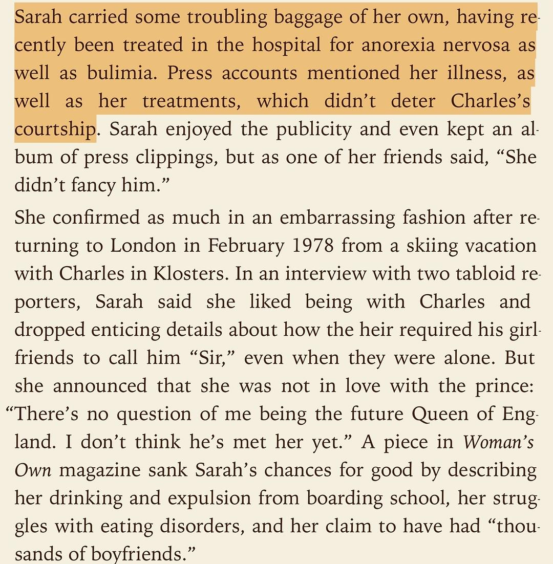 戴安娜在自传里这么说,但事实真的是这样吗?根据戴安娜身边的人她在70年代中期就已经患有eating disorder了,戴安娜也有一次说漏嘴,自己厌食是跟姐姐Sarah学的。
