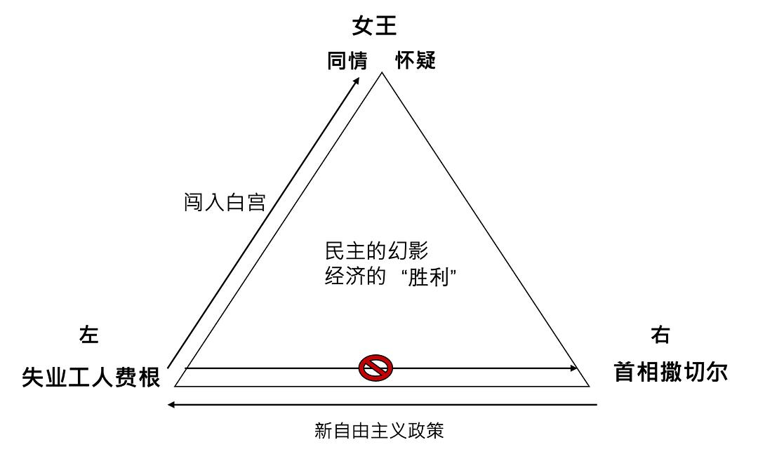 仅仅就剧情来说,它呈现了一个极具张力的三角关系:费根-撒切尔-女王。我画了一个简陋的图来简单说明。从最直观和简洁的关系来看,撒切尔的政策导致了平民费根生活的不堪,他认为这是系统的问题,想通过直接与撒切尔谈话来纠正这个系统,然而这个通道被堵死,于是他只有不借助任何系统直接以个人的行动,闯入这个系统的最高层,面见女王,以争取纠正这个错误的系统。他在直接目标上成功了,却在最终目标上失败了,因为女王没办法约束撒切尔的政策。