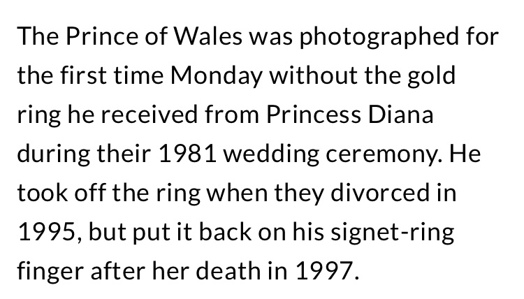 2.离婚后查尔斯摘了结婚戒指(他之前一直戴在小指,和尾戒戴在一起,剧里也看得到这个细节)但这个结婚戒指在戴安娜车祸去世后他又戴了起来,一直到2005年再婚前几个月才摘掉