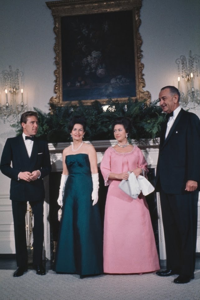 现实中,Margaret和Johnson总统见面时,穿着粉色长裙搭配短上衣,上衣领口和袖口均有流苏装饰,公主带着钻石耳环和项链,是非常端庄得体的造型。
