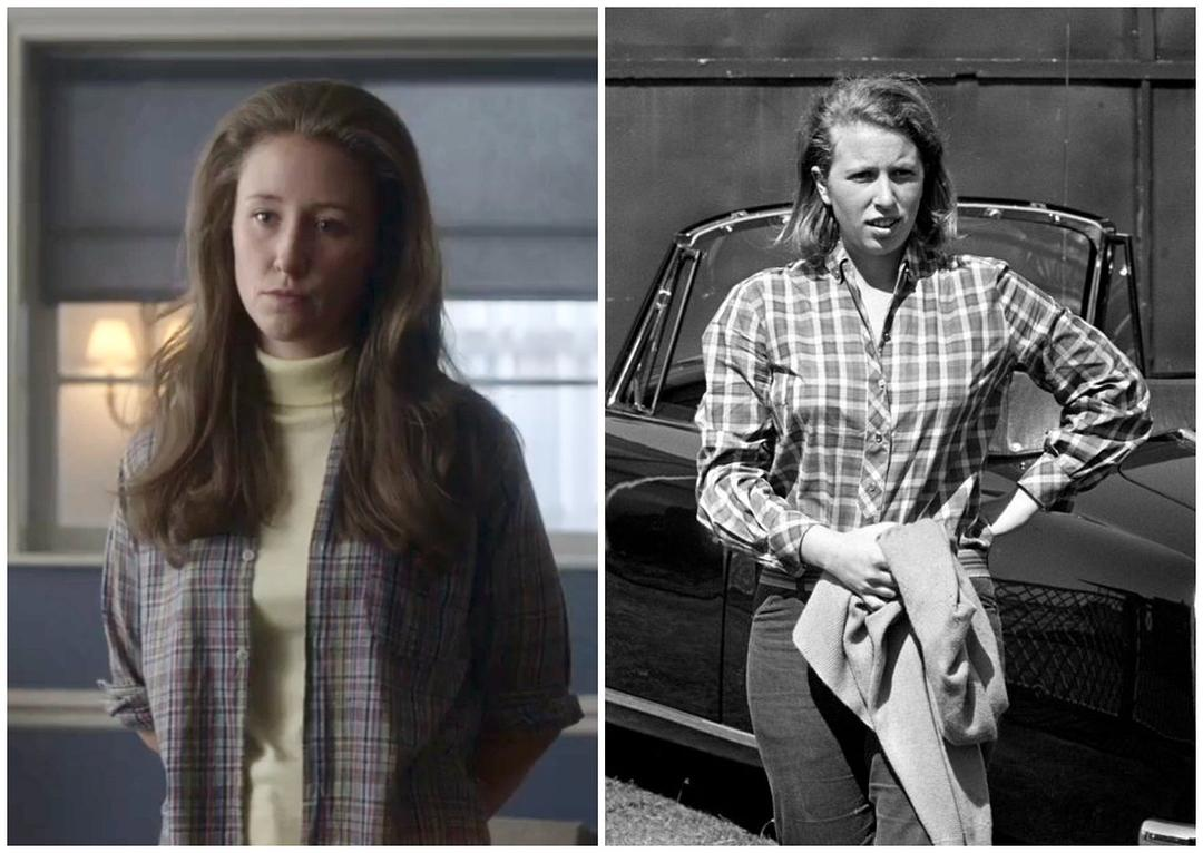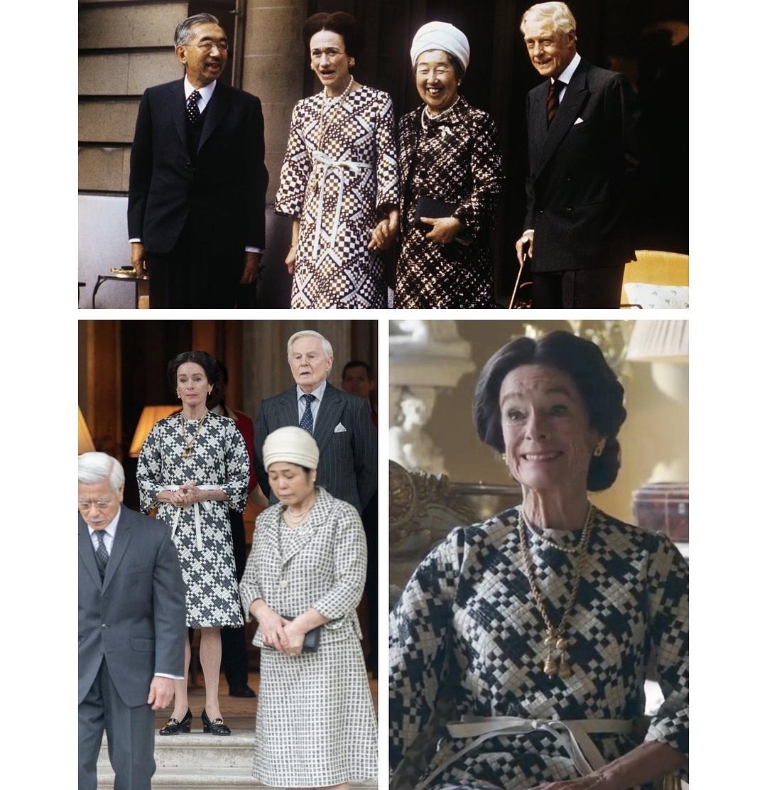 1971年日本裕仁天皇和皇后到访温莎公爵和夫人在巴黎的住所。Simpson本是穿着格纹连衣裙,腰间系突出的白色腰带;剧中Amy把格纹换成了千鸟纹,据说这样观众透过电视比较容易看清楚。这个最会穿衣服的女人用一条珍珠项链混搭一条金质长链;剧中用的珍珠项链个头偏小一些。