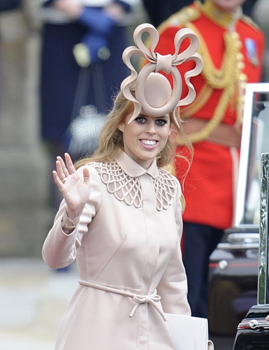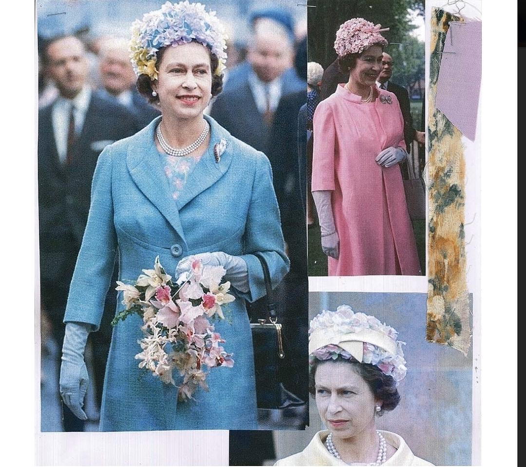 Margaret公主穿着玫红色外套连衣裙,深粉色缎束起发髻;王太后的柠檬绿蕾丝裙和鹳鸟羽毛帽十分醒目;Anne公主的蓝色迷你外套连衣裙更为新潮,佩戴的圆盒帽后有很大、易辨识的花状装饰。其实,Amy在领口和腰间等处做了些许改动。