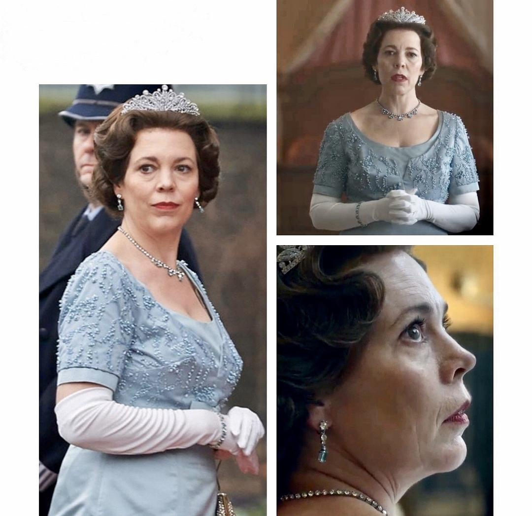 Olivia版女王陛下有三套礼服裙是极美的。一套菱纹格镶金片短上衣配嫩绿色无袖缎面裙,戴钻石王冠和珍珠耳环;一条浅蓝色镶同色系珠子短袖缎面裙,戴钻石王冠、蓝宝石项链和耳环。