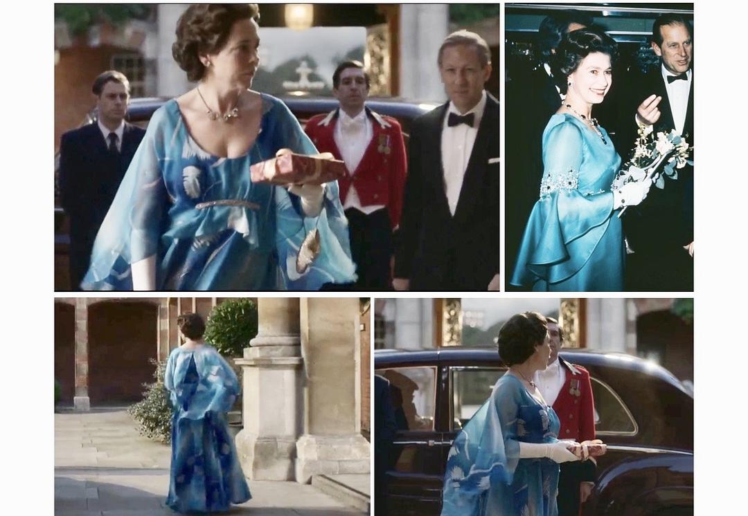 1974年,女王和菲利普亲王在伦敦观影时的照片。此时女王穿的深蓝色丝质长裙,荷叶袖上镶着钻石,非常飘逸。剧中女王去为妹妹Margaret庆生,穿了另外一条更为飘逸的长裙,蓝白色印染,走动时后背的薄纱会飞扬起来。