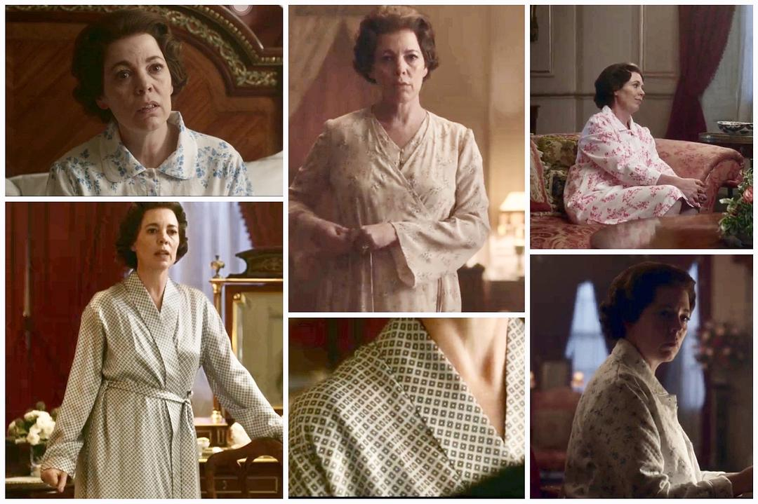这一季女王穿睡衣的镜头比较多,尤其是E03中Aberfan矿难一集。女王的睡衣较为朴素,多有温柔的碎花。细小菱纹格淡绿色丝质睡袍最惹人爱。