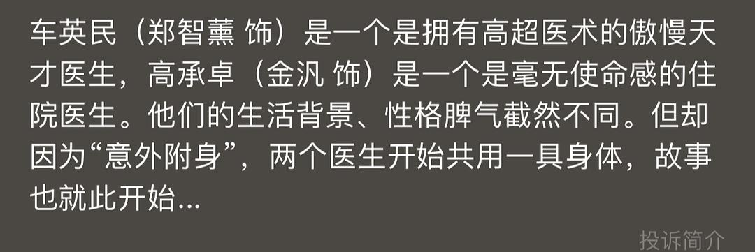 事实证明,带点儿奇幻严肃的正剧,要比原本的正剧好看一些,但本剧还是偏向医疗正剧,奇幻内容大大减弱,附身的笑料并没有想象中那么多,甚至没几集之后就开始消解应该有的一些冲突写法,导致本剧一大半内容和普通医疗剧没什么区别。nn不过虽然跟想象中的差距很大,但本剧整体还是比较不错的,演员也都选的很好,还是值得看一看的。