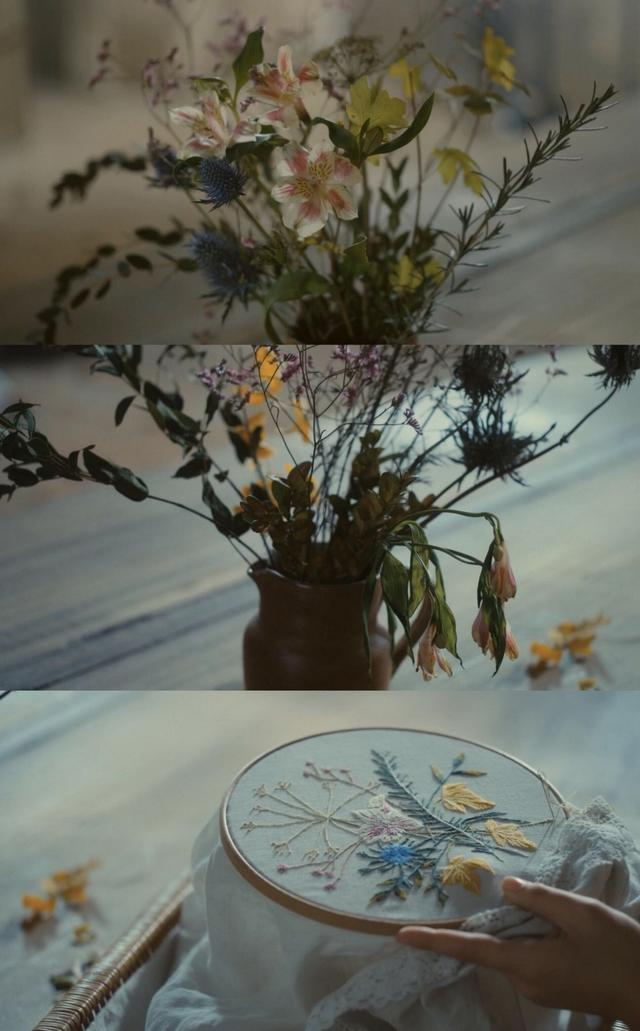 刚开始绣时,盆中的花朵明媚鲜妍,生机勃勃;等到刺绣即将完成时,鲜花已然颓败凋零,而绣布上的图案却保留着最初的模样。