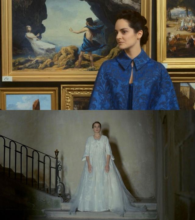 再对比角色的服装,此时玛丽安就穿着宝蓝色上衣,而当年的埃洛伊兹正是穿着白色嫁纱和她做最后的道别。