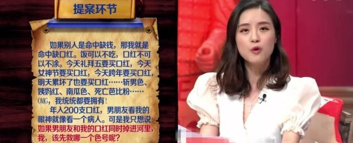 第五季第一期讨论的就是“男朋友和口红掉到水里,你会先救哪个色号?”的问题。