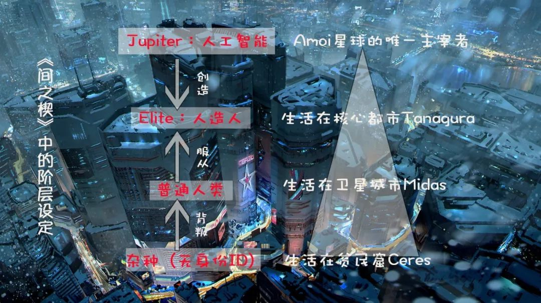 Jupiter统治下的Amoi,是一个获得宇宙联邦高度认可,和谐稳定,人人“安居乐业”,几乎没有犯罪的繁华星球。也和所有类似神话一样,和谐之下,自然是森严的等级制度和高压维稳。Jupiter作为一台已经诞生自我人格,神化(“Jupiter”意指希腊神话中的全能大神宙斯)的人工智能,全面渗透进了星球所有角落。它还制造了没有感情,高度理性,智商发达,力量超人,金发碧眼,外貌绝美的人造人(简直以《圣经》中的天使形象来打造,毫无任何缺陷)协同自己统治星球。 这些人(或者叫人造人更合适,他们没有性欲,也没有生育能力)居住在Jupiter直接统治下的中央都市“Tanagura”,称之为Elite(精英),按照法律,人造人依发色分为不同阶层,由下到上分别是“Onyx(黑发)”;“Ruby(红发)、Jade(绿发)、Sapphire(蓝发)”;“Platina(银发)”。位于金字塔尖的精英被称为“Blondy(金发贵族)”,他们是唯一拥有直接和Jupiter交谈权力的阶层,故事主角之一Iason则是这个绝对精英阶层中的绝对精英分子。