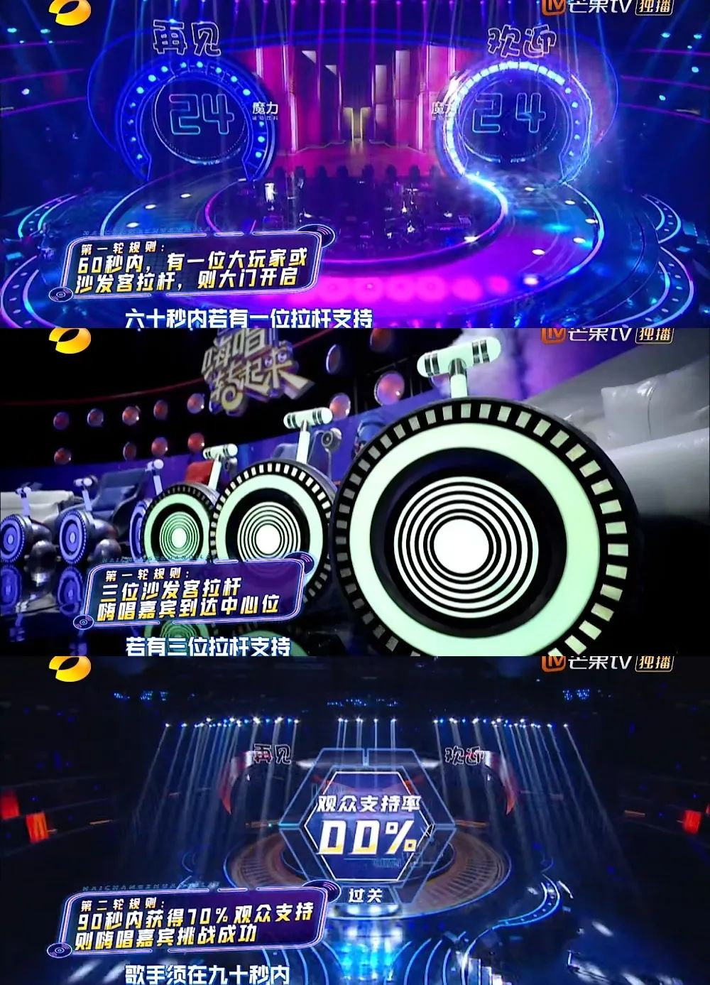 从第一季走到第二季,节目规则始终未变:第一轮60秒的演唱时间内,一位沙发客推杆,舞台外开唱的嘉宾即可转入“赛道”,获得三位沙发客推杆认可,嘉宾则会停留在中心位演唱完毕;第二轮90秒内嘉宾再次演唱,获得70%观众支持(第一季是80%)则可留在舞台上。