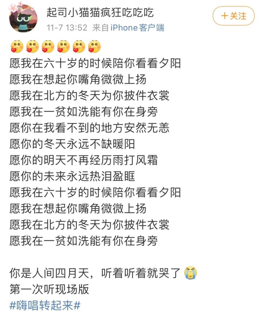 在微博,有观众听小阿七演唱《你是人间四月天》时默写“愿我在六十岁的时候陪你看看夕阳,愿我在想起你嘴角微微上扬”的歌词,结果“听着听着就哭了”;也有人在豆瓣给节目打出5星好评,理由是,“总有那样一首歌,能让我轻轻跟着哼。”