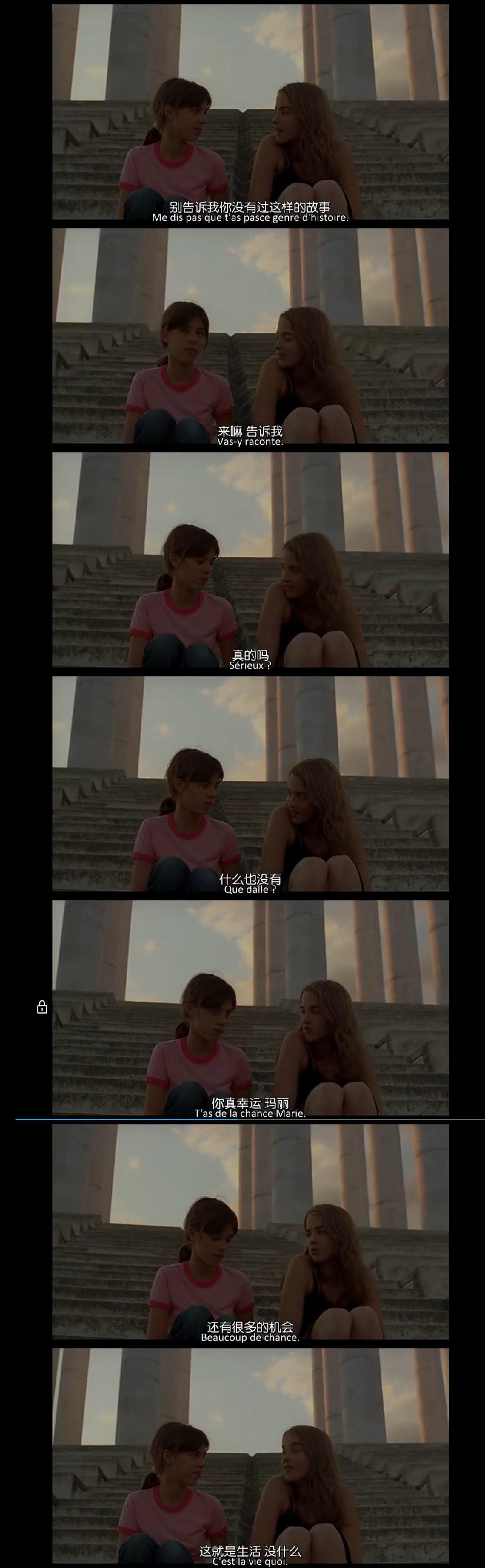 席老师对女性的偏心就不用多说了。她用一切镜头去表现她们之间的陪伴、支持、理解、矛盾以及爱。我在想的是,这部电影的内核是什么呢?成长的线索相当微妙,一切都进行得很柔和,没有明朗的戏剧冲突,细腻的日常就像水波缓慢地荡漾。或许也并不能定义为一部讲女同性恋的电影,纠结Floriane到底爱不爱Marie只会把主题庸俗化和浅薄化。