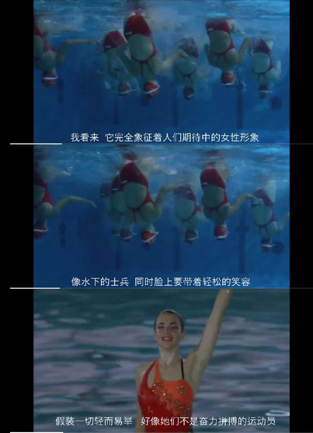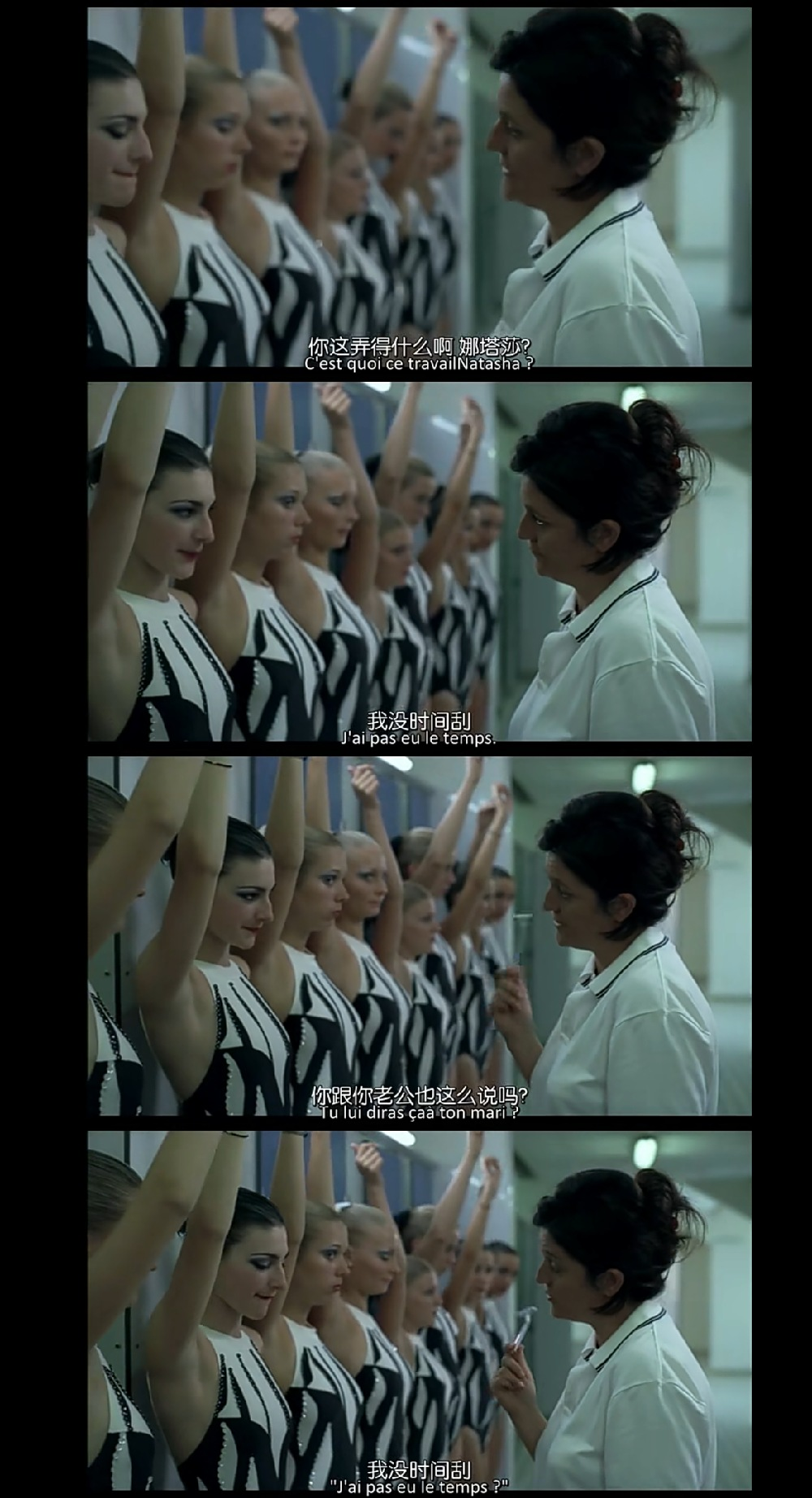 關於游泳池與水上芭蕾n 游泳池很入鏡。很多法國電影都有游泳池的鏡頭,通常都是出現在女主角思考的時候,她游幾下然後反省自己的生活…。在有些電影裡它是禁閉的空間,反之,在其他電影裡則是代表自由…。對我而言,它是個溼的空間,慾望在這裡產生,祕密被揭露…。這也是一個有自己法則的世界,有導演求之不得的豐富視覺跟聲音元素。水上芭蕾是一個有不同階層,管理更嚴格的世界。我完全著迷在它可以作為記錄片的層面,這是個我不了解但又極其迷人的世界。它是百分之百的女性運動,因此我們能夠用它來討論女性特質。它是非常困難的體育運動。女孩們每週要訓練十五小時,她們的體能要特別好,但是又幾乎毫無前途,因為沒有職業水上芭蕾舞者。這也是個要求很多地方都要被隱藏起來的運動。女孩們要讓它看起來很輕鬆,而且一定要面帶微笑。這是它讓我很感興趣的原因。水上芭蕾舞者像是裝成洋娃娃的小戰士,她們同時要戰鬥又要引誘…。n