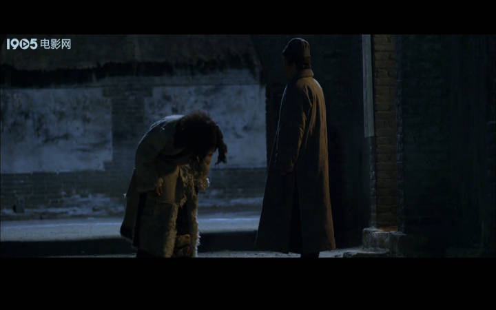 白狼盯女主的时候,老鹰跟兔脚遵照白狼的吩咐先行到了镇上的铁匠铺跟胖子会和。影片对镇子的这段描摹地特别认真细致,先是一个全景,然后镜头对到全景图左边的肉铺,再由肉铺移到旁边的铁匠铺,铁匠铺旁边不远处就是孔先生的蒙汉私塾。