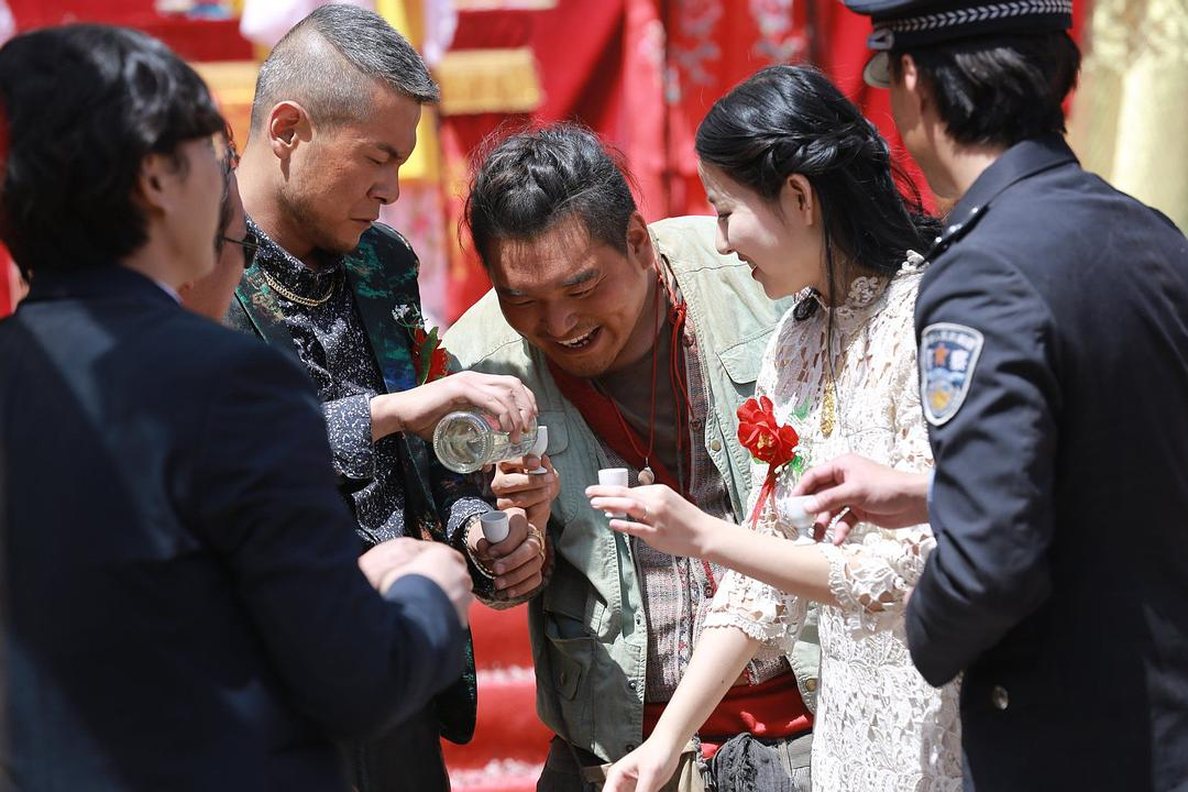 首先是现代和传统的对立统一。在电影的开篇,其背景是残垣断壁的甘肃土城龟城,听这名你就能知道是多么一个鸟不拉屎的地方,坍塌的古城土墙,漫天纷飞的黄沙,一张张被阳光晒的通红粗糙的脸,耳边传来的是土味十足的甘肃土话,乡村结婚时嘈杂的音乐。好一派穷村婚宴图。然而就是这样的背景中却出现了几个极其不协调的甚至是说扎眼的身影。穿的五颜六色一身“暴发户”装扮的新郎大贵,身穿一身能在龟城买几栋房子西服的落魄者一平,满手戒指的台湾商人的陆哥,油光粉面的律师JACK和两个人民警察。和背景环境形成了强烈对比,给人一种强烈的荒诞之感,也暗示着一场荒诞的好戏即将开演。一场现代商业社会的金钱崇拜与人性中传统美好一面的战争一触即发。