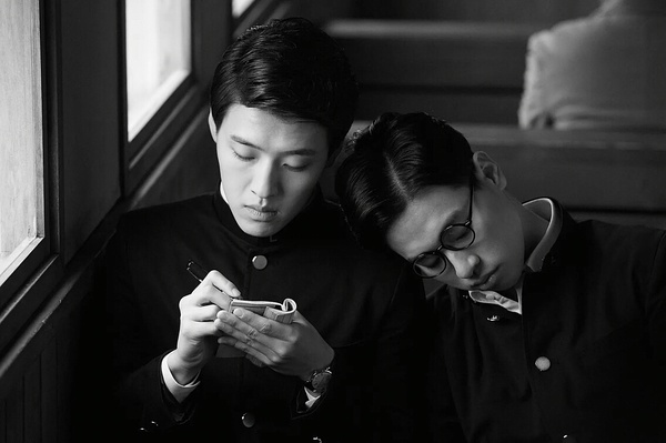 影片的这种立意也在形式上得到了某种恰到好处的应和。《东柱》采用了双主角的结构(虽然片名叫做《东柱》,至少我们很难分清两人之间谁的戏份更多),这一点很容易让我们想起导演的上一部影片《思悼》,少年时代的尹东柱和他的挚友,同时也是表兄宋梦奎一起出生在中国,这是一个远离了他们故土的地方,兄弟两人一个热爱诗歌,一个擅长散文,双双沉醉于文学的汪洋之中,成长后的二人回到朝鲜就读,进而考入东京的大学深造。本来亲如手足的他们却因为观点的分歧逐渐走上不同的道路,正如鲁迅和周作人的多年恩怨一样,尹东柱将诗歌看做纯粹的情感抒发,他既不理解政治,也不愿参与其中;而宋梦奎则顺应时代投入到学生运动的洪流,办杂志、创社团,像每一个爱国青年都曾热血沸腾过的那样,为了朝鲜的独立而四处奔走。决然不同的两人在影片的叙事进程当中为我们提供了理解尹东柱的不同可能:他究竟是一个不谙世事、单纯幼稚的天真诗人,或者是一个在宋梦奎的反衬当中超脱现实的遁世青年,他的边缘人处境,究竟是一种不屑的叛离,还是被时代放逐的无奈。