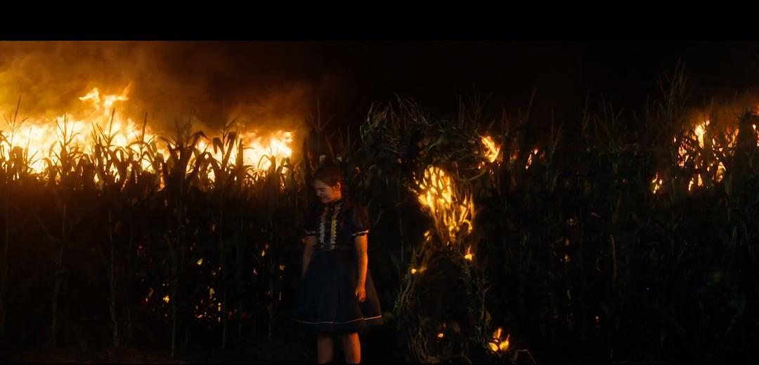 此时,女主的父母都被小女孩带着其他孩子们杀害,女主也被淋上车的燃料,但是女主开始逃跑。奔跑和找到车后,驾车逃跑的过程中让燃料(车上的油箱也坏了,燃料洒出来)洒满玉米地,最后女主点燃火焰,火焰开始燃烧,燃烧到仓库,和其他易燃物发生爆炸。玉米地被彻底燃烧,怪物也被燃烧。