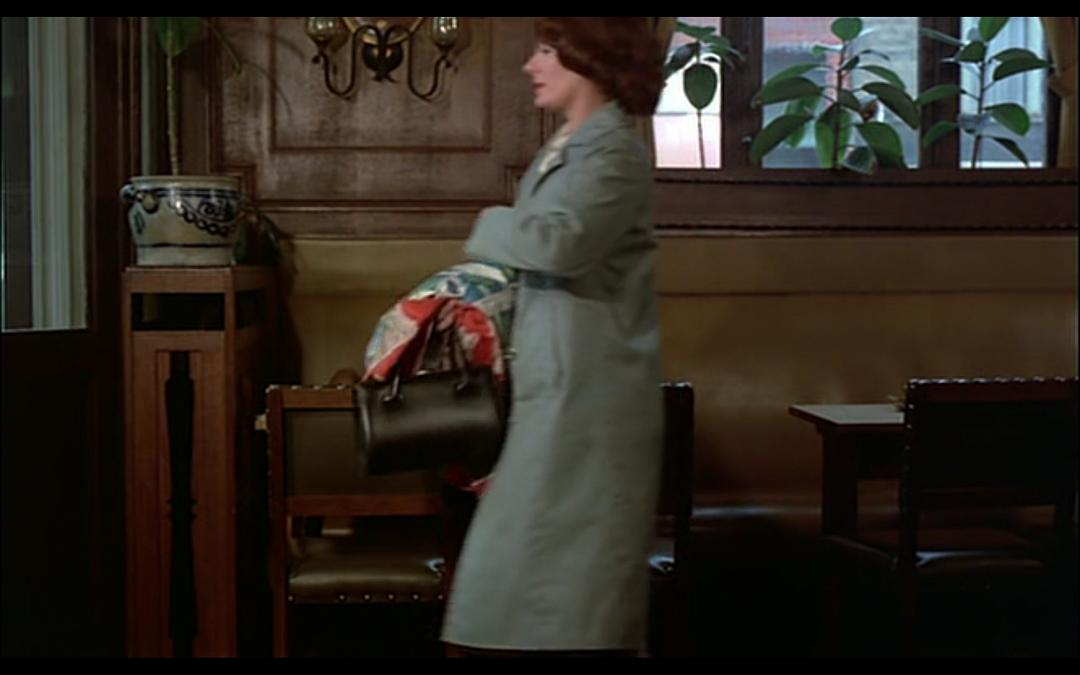 还有一个较为重要的场景是咖啡厅。咖啡厅的第一次出现是在第二天下午,让娜买完毛线以后来咖啡厅喝杯咖啡,这是她生活中为数不多的闲暇时刻。值得一提的是,这一场景几乎是(全片中罕见的)完全静止的,除去端起和放下咖啡杯的细微动作,让娜始终位于画面中央静坐,像是发呆,也仿佛是在想什么心事,这个镜头是一次视觉的注目礼,是引导我们认同并走进让娜内心世界的有效方式: