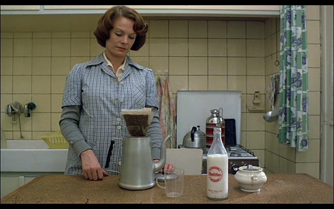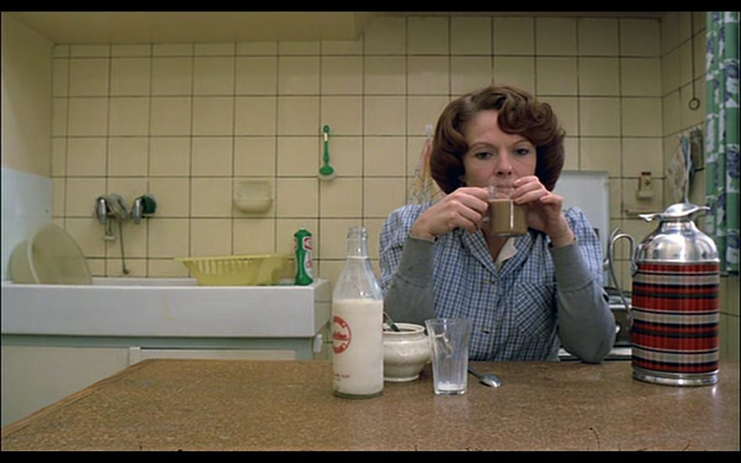 让娜·迪尔曼是一位妓女,但同样重要的是,她很像我们的母亲:一力承担所有的家务,而且做家务都有特定的顺序。阿克曼以及摄影师 Babette Mangolte,她们虽然与传统妇女的选择不同,但是继承了母系社会的精简。在一个镜头里,让娜·迪尔曼在拿东西、做事情,摄影机就呆在固定方位,隔着张桌子,隔着点走廊,在这个位置上,它不会打乱她,而是看着她干活的步骤。比如当她在卫生间和卧室当中来回走动时,摄影机就放在卫生间外面的走道上,而不是跟进跟出。