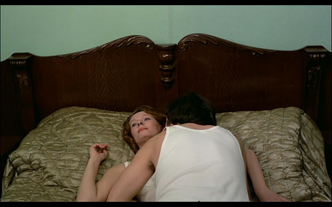 当让娜走出厨房,来到走廊以后,影片紧接着向我们展示了她的另一重身份——一个妓女。走廊蕴含的信息主要集中在门口,其余部分则只是被让娜的走动所填满。门口是让娜每天中午迎接邻居、下午迎接客人、晚上迎接儿子的场所,三天内门口发生的事件也很好地折射出了让娜的变化。第一天晚上儿子回来,让娜起身前去迎接并亲吻儿子;第二天中午在门口与邻居寒暄了较长时间;第二天晚上,儿子回来,让娜并未迎接而是呆坐着;第三天中午与邻居仅两句招呼再无其他。让娜的“失语”不是一种偶然,我们可以从两个方面来分析。一是她与儿子关系的隔阂。这里可以谈到“客厅”这一重要场所了。首先这是一个公共空间,尽管只有她和儿子两人,但他们的谈话并不亲密,而是客客气气的,比如让娜全片开口说的第一句话是:“别一边吃饭一边看书。”让娜例行公事般地读信、检查儿子背书情况等,更多时间两人是沉默。而到了夜晚,“客厅”转变为儿子的房间,这也暗示着公共空间向私人空间的转变。儿子睡前的两段对话都是私人的,这才是真正意义上的母子交流。但这样的交流却也并未显出亲密。在第一段对话中母亲是谈话主体,在诉说和逝去的父亲的当年往事,而儿子却反问母亲为何不再婚,他对母亲的选择没有丝毫的理解;而第二段对话则是儿子滔滔不绝地说着自己的心事,母亲却没有任何回应,直接以“太晚了”搪塞过去。在第二处场景中,母亲站在门口,儿子斜倚在床上背对母亲,这就像是我们日常生活中的场景,同时这一处景深也直观地表现出母子的隔阂。其二,让娜的“失语”归因于她对过去的沉湎。在一场找纽扣的戏里,让娜在与一位店主的谈话中详细地说着关于这件衣服的故事,往日的美好时光仿佛一一在她眼前重现,然而这种怀缅终究是得不到回应的,我们都无法走进让娜的世界。