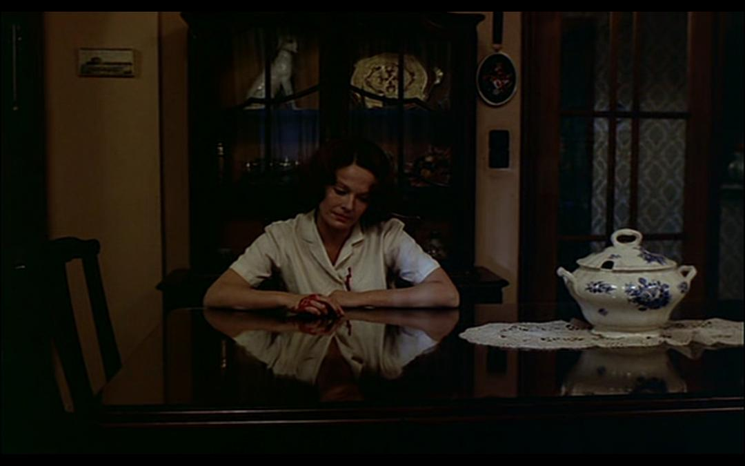 而让娜第二次来咖啡厅的场景则更有意思。她进门后先是愣了一下,发现门口的位置被人占了——这说明这是她常坐的地方,而当她坐到相邻的座位之后,镜头并未随着让娜转移,而是依然凝视着原来的位置。于是让娜被挤压到了画面的边上(这不是让娜第一次位于画面边上,但是是我们第一次感受到明显的挤压,因为画面的中心是被一个从头到尾一直存在的陌生人所占据的)。这两次喝咖啡的位置的转变(在构图上反映为由中心到边角)正是让娜失常的标志。让娜依然发了会呆,但这次她却没有喝咖啡。她静静地调好了咖啡,手指微微端起咖啡杯,然后猛地一放,收拾东西离开了。原本我以为这里导演又用了一次跳接,像前两次男人进出卧室门之间发生的事,以及第二天吃晚饭的过程,都被略过而代之以前后的两个动作。但我反复看了两遍以后发现,这里丝毫没有剪辑的痕迹,让娜真的没有喝咖啡!为什么这一小小的动作如此重要呢?正如我前面所说,咖啡是走向失常的伏笔,此时的让娜连享受下午这片刻闲暇的心情都没有了,这也正是她在杀人前所做的最后一件事——或许正是在此刻她下定了杀人的决心,这一意外的举动将那种焦躁不安、反复挣扎的心境展现得淋漓尽致。